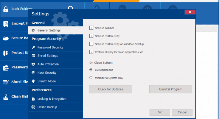Folder Lock provides the ability to protect your vaults from hacking using password mining. In the settings you can specify the number of attempts to enter incorrect data, after which the program or Windows account will be logged out or the computer will be shut down. The module window displays a history of how many times an incorrect password was entered and what characters were used.