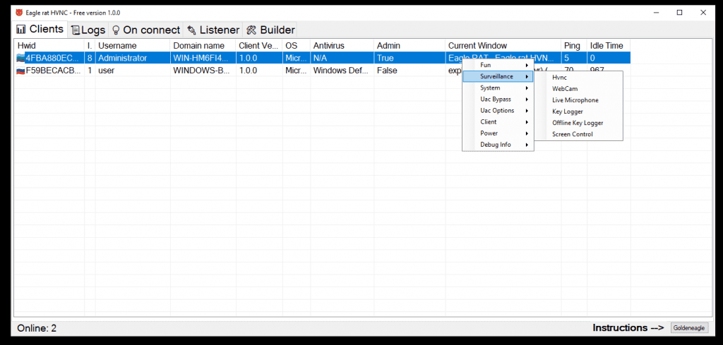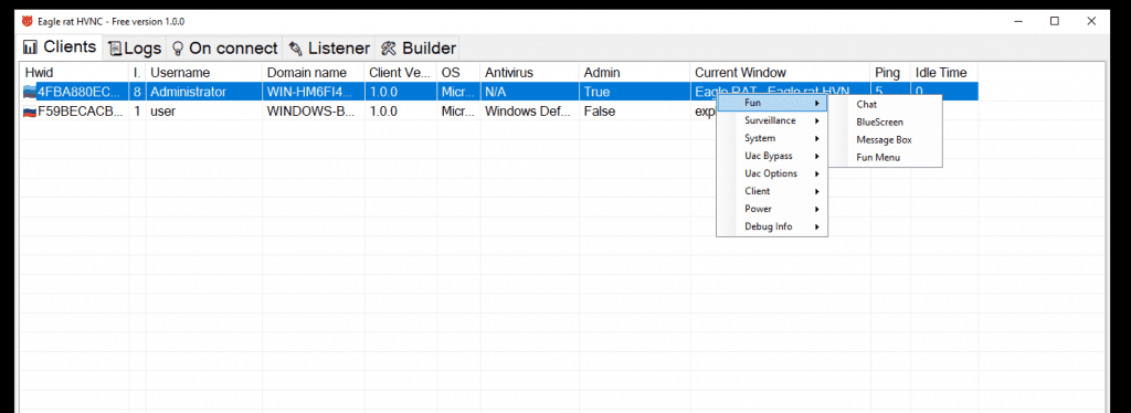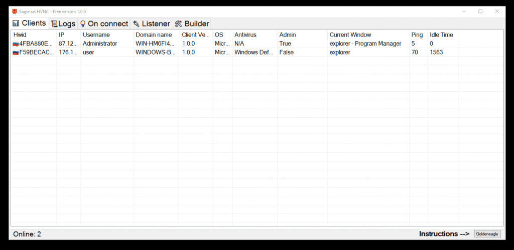 After launching the file is fixed in the system and starts with the system in hidden mode. There are many different functions. The main one is HVNC for hidden desktop.