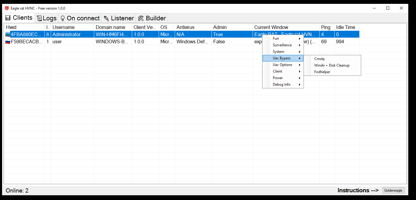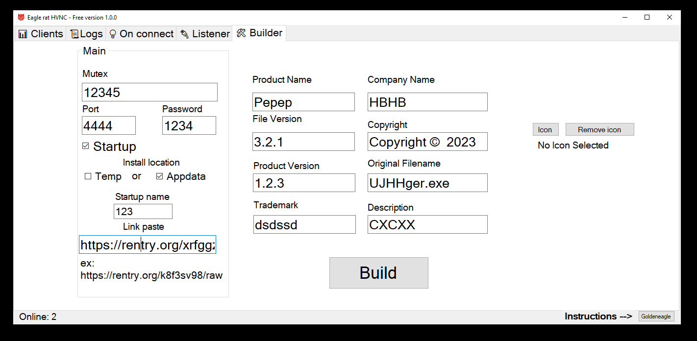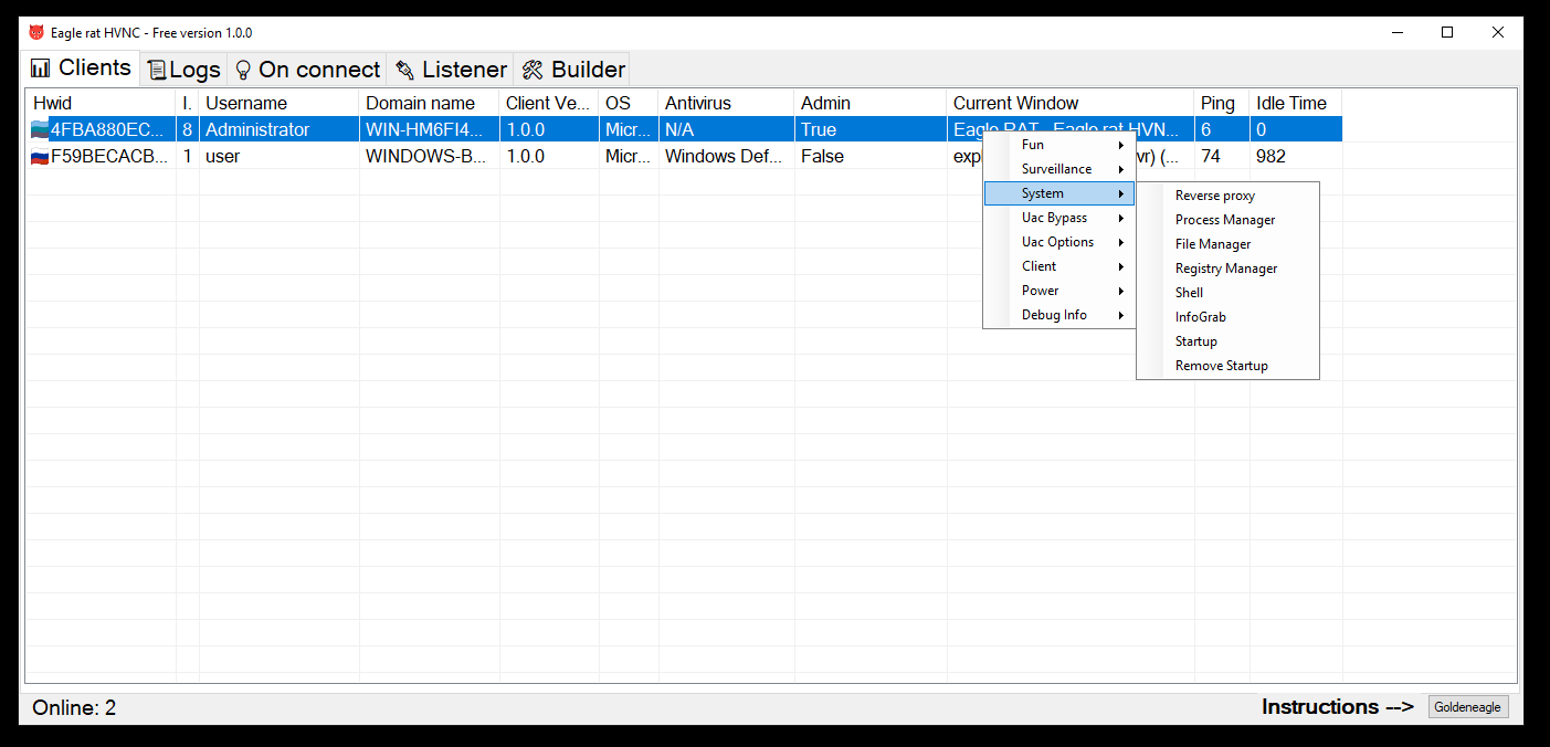 After launching the file is fixed in the system and starts with the system in hidden mode. There are many different functions. The main one is HVNC for hidden desktop.