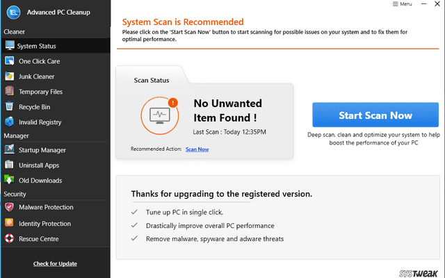 Cleaning your PC has become easier with Advanced PC Cleanup. Get rid of redundant apps and files from your computer in a few clicks. Safeguards your computer from potential malware threats and removes the personal information saved online. Disable startup items and uninstall unwanted apps to enhance PC speed.