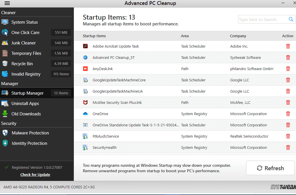 Cleaning your PC has become easier with Advanced PC Cleanup. Get rid of redundant apps and files from your computer in a few clicks. Safeguards your computer from potential malware threats and removes the personal information saved online. Disable startup items and uninstall unwanted apps to enhance PC speed.