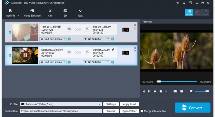 The Aiseesoft Total Video Converter can easily convert between various video formats such as MP4, H.264/MP4 AVC, H.265/HEVC, MTS, MXF, MOV, AVI, DivX, WMV, MKV, FLV, WTV, VOB, and more. Whether your video is downloaded from online video-sharing sites (YouTube, Dailymotion, Vevo, etc.) or recorded with a camcorder or mobile phone, this video conversion software can fully meet your demands.