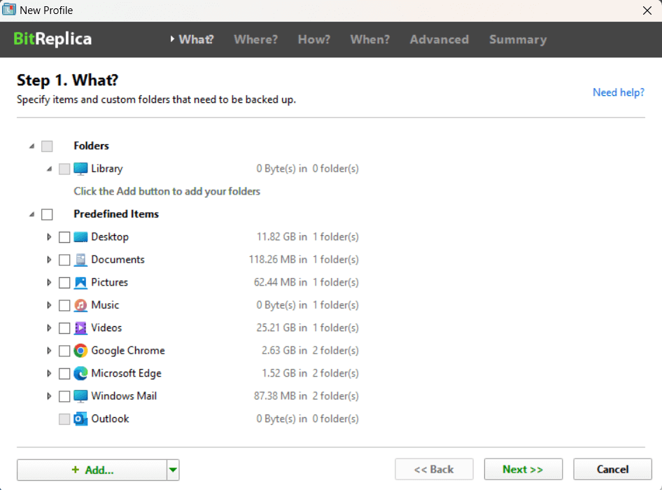 You can specify file groups to back up, such as IE favorites or Windows mail contacts, or select individual folders to back up under each profile you create.