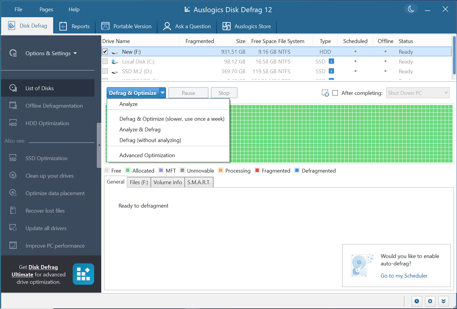 Disk Defrag Ultimate lets you defrag files inaccessible during system operation and optimize file placement on your hard drive to ensure faster access and the most efficient operation. The multiple scheduling options let you easily maintain consistently high HDD speed.