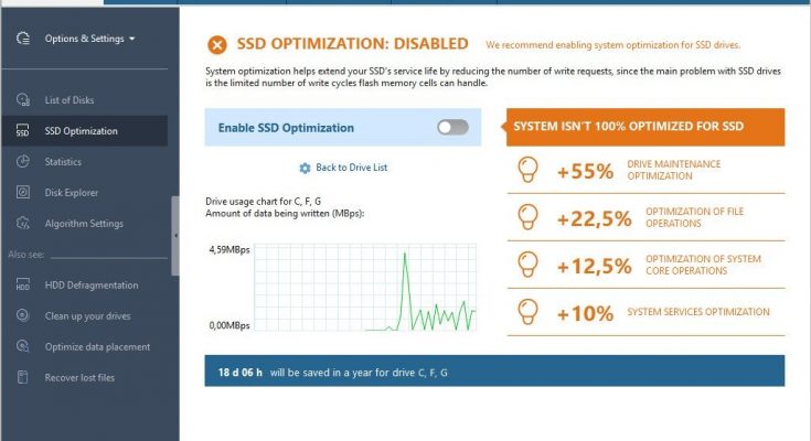 SSD Optimizer allows you to check your SSD health, view the amount of data being read from and written to your SSD drive, and access other real-time data on the drive’s status. Choose the time period to display the stats for and see the drive’s estimated service life.