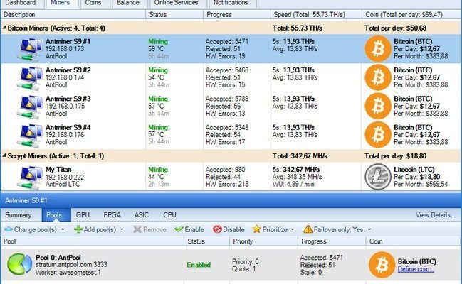 Profitability Switching Awesome Miner Next generation profitability switching uses both real-time multi-pool statistics and coin statistics to automatically switch between multiple pools, algorithms and mining software to always ensure highest possible profitability. Awesome Miner can also display information, exchange rates and do profitability calculations for Bitcoin, Litecoin and all other popular coins.