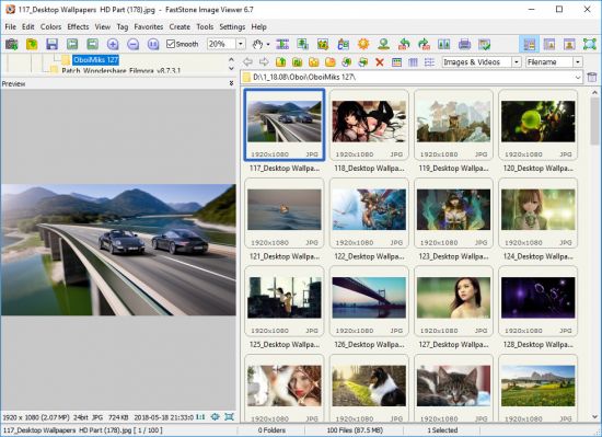 FastStone Image Viewer is a fast, stable, user-friendly image browser, converter and editor. It has a nice array of features that include image viewing, management, comparison, red-eye removal, emailing, resizing, cropping and color adjustments. Its innovative but intuitive full-screen mode provides quick access to EXIF information, thumbnail browser and major functionalities via hidden toolbars that pop up when your mouse touches the four edges of the screen. Other features include a high quality magnifier and a musical slideshow with 150+ transitional effects, as well as lossless JPEG transitions, drop shadow effects, image annotation, scanner support, histogram and much more. It supports all major graphic formats (BMP, JPEG, JPEG 2000, animated GIF, PNG, PCX, TIFF, WMF, ICO and TGA) and popular digital camera RAW formats (CRW, CR2, NEF, PEF, RAF, MRW, ORF, SRF and DNG).