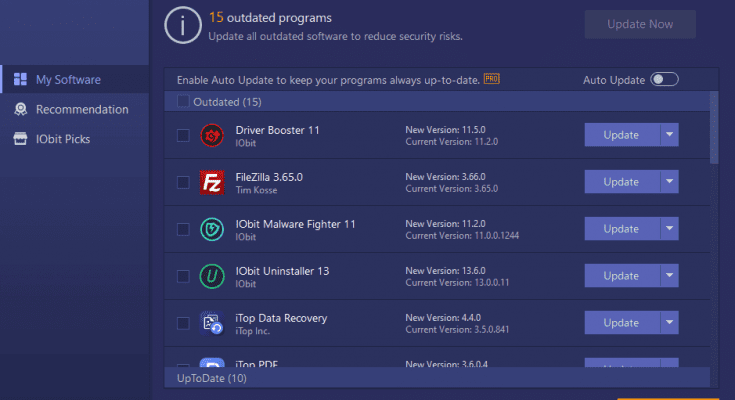 IObit Software Updater – Update Your Software in Real time & No Beta version or even Bundleware Bothered. Outdated software may leave some risks to your PC. It’s better to keep all software up-to-date. With 180% larger software database, IObit Software Updater can automatically scan and update your software in a scheduled time without bothering you, and you just need to list your software in the “Auto-Update List”.