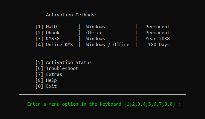 A Windows and Office activator using HWID / Ohook / KMS38 / Online KMS activation methods, with a focus on open-source code and fewer antivirus detections.