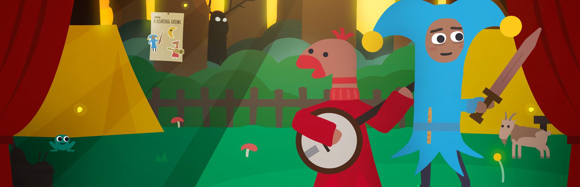 Travel the kingdom as Jester with his best friend Sok to improvise theatre shows and perform on stages far and wide. Sing your hearts out, crack jokes and impress audiences to become the stars of the famous Royal Theatrical Spectacle!