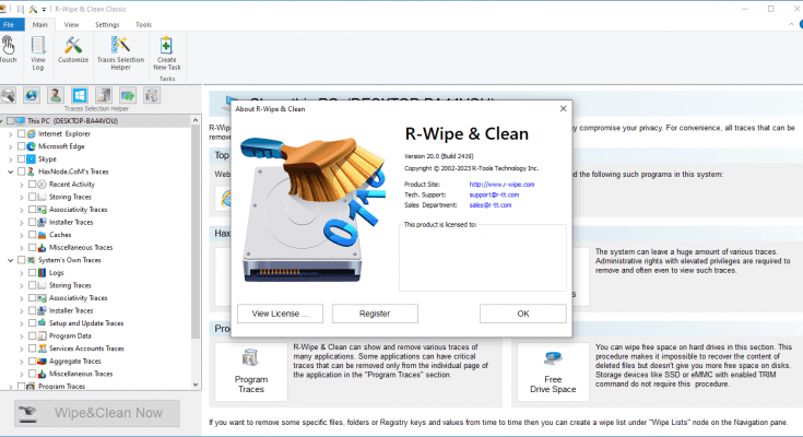 R-Wipe & Clean is a complete R-Tools solution to remove useless files, free up your disk space, and clean various privacy-compromising information on your online and offline activity. This includes internet history and cookies, lists of downloaded files and opened documents, various data caches, temporary files, and many more items, created by the operating system, most contemporary internet browsers and communication programs, and by hundreds of third-party applications.