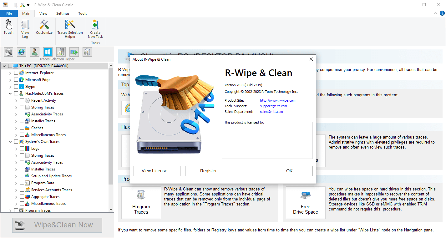 R-Wipe & Clean is a complete R-Tools solution to remove useless files, free up your disk space, and clean various privacy-compromising information on your online and offline activity. This includes internet history and cookies, lists of downloaded files and opened documents, various data caches, temporary files, and many more items, created by the operating system, most contemporary internet browsers and communication programs, and by hundreds of third-party applications.