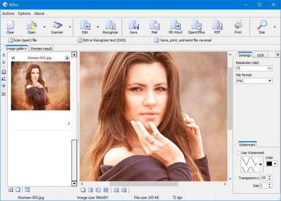 RiDoc – the program for getting images from a scanner and reduction image files sizes. This program reduces the electronic document or image files size without decreasing of image quality. With the help of the Assembly function the image frame is fit to A4 page format and image file size is reduced without picture quality decrease. Convertion of documents in to a graphical format makes it possible to protect these documents from unauthorized copying. To increase the document protection level you can apply watermark to the final document.